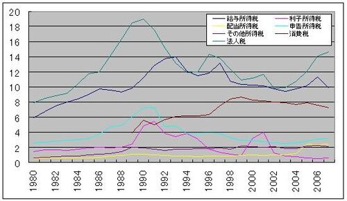 nyanko-wonderfulさんとBaatarismさんが相次いで消費税増税を取り上げ、消費税をはじめとする各種税金の推移グラフを示した。それらのグラフを見て小生の目を惹いたのが、話題の消費税や法人税の推移もさることながら、バブル崩壊以降の所得税の急低下ぶりで…