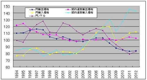 昨日に続き交易利得ネタ。最近の円安に関して、交易利得への悪影響を懸念する声が時々聞かれる。では、為替レートはこれまでの交易利得にどの程度の影響を与えてきたのだろうか? まず、日銀の輸出入物価指数と円レートの推移を見てみよう。 このグラフは年…