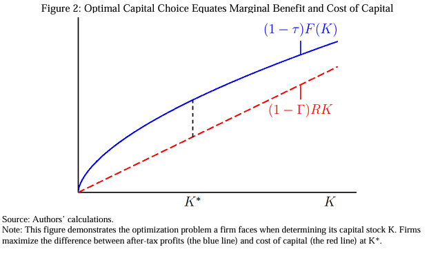 *1:本文では「the ratio of the price of capital net of the cost-of-capital subsidy to the net-of-corporate-tax rate—that is, (1-Γ)/(1-τ)」と説明されている。ここでτは新規投資から得られる所得への限界税率で、資本ストックKを持つ企業の税引き前利益はF(K)、税引き後利益は(1-τ)F(K)となる(下図の青線)。Γは資本費用補助金で、減価償却控除ならびにあらゆる投資税額控除の現在価値を織り込んだものとなる。具体的には、投資刺激策によって資本の実効取得費用が減少する割合であり、投資税額控除が無い場合、新規投資への所得税率τと減価償却控除の割引現在価値の積となる。企業が資本ストックを維持するためには資本の使用者費用(ユーザーコスト)を支払う必要があるが、単位当たりの資本の使用者費用は(1-Γ)Rとして表される(下図の赤点線の傾き)。ここで資本の使用者費用は、資本を一単位購入し、ある期間使用し、(償却していない)残存資本を次期に売却する費用、と解釈される。企業は青線と赤線の差が最大になる資本K*を選択する。