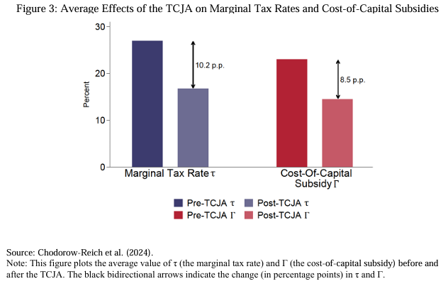 我々は、米史上最大の法人減税である2017年の減税・雇用法案における企業条項を評価した。我々は5つの教訓を引き出した。第一に、税率引き下げと費用化の範囲拡大により法人税収は40%減少した。第二に、実効税ウェッジ*1の低下が大きかった企業は、投資を相対的に増やした。集計ベースでは、企業の総有形資産投資は11%増えた、というのがこの分野の研究の大まかなコンセンサスである、ということを我々は示す。第三に、法人税条項による経済成長と賃金の押し上げは法案の推進者が宣伝したよりも小さく、長期のGDPの押し上げは1%以下で、雇用者1人当たりの労働所得の押し上げは1000ドル以下だった。第四に、米国に本社を置く多国籍企業による海外投資を増やした条項は、それら企業の国内事業も押し上げた。第五に、加速償却のように期限切れとなった、および期限が近付いている条項の幾つかは、他の条項よりも1ドル当たりで多くの投資をもたらした。