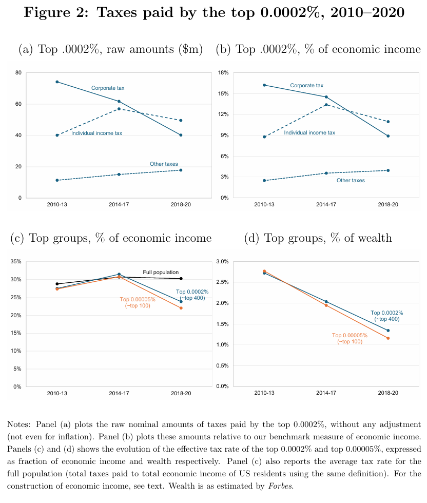 Our paper analyzes the results of a match of the Forbes 400 group to administrative data, including individual income, business, estate, and gift tax data. Top 400 individuals have a total effective tax rate of 23.8% in 2018-2020, down from about 30% earlier in the decade. This is lower than the average tax rate for the full US population and substantially lower than the total effective tax rate for top labor income earners.